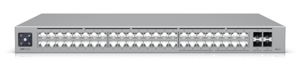 Ubiquiti Pro Max 48. Capa del interruptor: L3. Puertos tipo básico de conmutación RJ-45 Ethernet: 2.5G Ethernet (100/1000/2500), Cantidad de puertos básicos de conmutación RJ-45 Ethernet: 48. Capacidad de conmutación: 224 Gbit/s. Estándares de red: IEEE 8