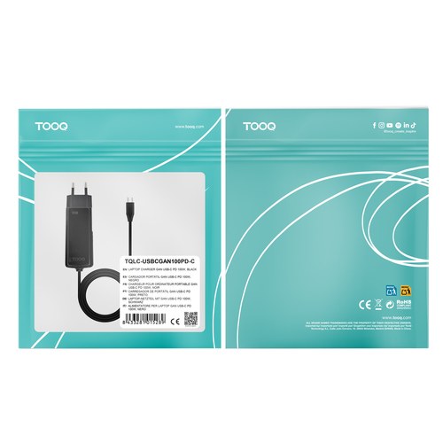 TooQ Cargador de portátil GAN USB-C PD 100W, Negro. Tipo de cargador: Interior, Alimentación: Corriente alterna, Compatibilidad del cargador: Portátil, Universal. Voltaje de entrada: 110-240 V, Voltaje de salida máximo: 20 V, Corriente de salida de adapta