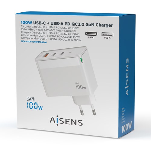 AISENS Cargador Gan 100W, 2xUSB-C PD3.0 QC4.0 QC5.0, 1xUSB-A QC3.0, Blanco. Tipo de cargador: Interior, Alimentación: Corriente alterna, Compatibilidad del cargador: Universal. Voltaje de entrada: 100 - 240 V. Cantidad de puertos USB 2.0: 1, Número de pue