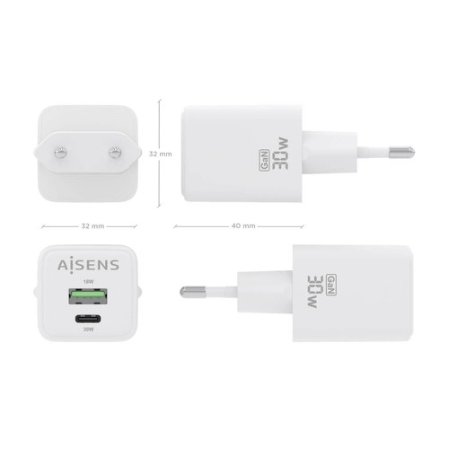 AISENS Cargador Gan 30W, 1xUSB-C PD3.0 QC4.0, 1xUSB-A QC3.0, Blanco. Tipo de cargador: Interior, Alimentación: Corriente alterna, Compatibilidad del cargador: Universal. Voltaje de entrada: 100 - 240 V. Cantidad de puertos USB 2.0: 1, Número de puertos US