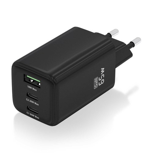 Cargador Gan 65W, 2xUSB-C PD3.0 QC4.0, 1xUSB-A QC3.0, Negro