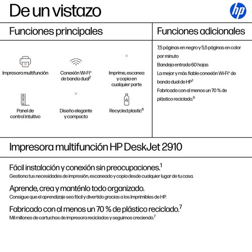 La HP DeskJet 2910 es una impresora multifuncional compacta diseñada para el hogar y pequeñas oficinas que necesitan imprimir, copiar y escanear de forma sencilla y eficiente. Incorpora conectividad Wi-Fi de doble banda y compatibilidad con impresión móvil, lo que permite imprimir fácilmente desde ordenadores, smartphones y tablets. Gracias a su diseño compacto y a su bajo consumo energético, es una solución práctica para tareas diarias con volúmenes de impresión moderados.