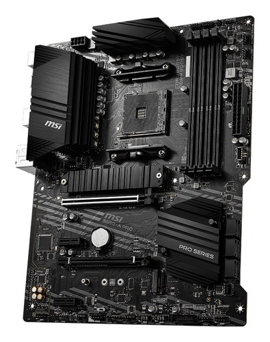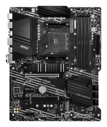 MSI B450-A-PRO. Fabricante de procesador: AMD, Socket de procesador: Zócalo AM4. tipos de memoria compatibles: DDR4-SDRAM, Memoria interna máxima: 128 GB, Tipo de ranuras de memoria: DIMM. Interfaces de disco de almacenamiento soportados: PCI Express, SAT