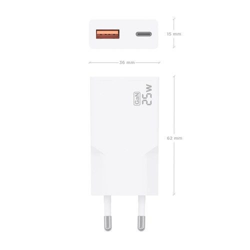 Cargador Ultra Delgado GaN 25W, 1xUSB-C PD3.0 QC4.0, 1xUSB-A QC3.0, Blanco