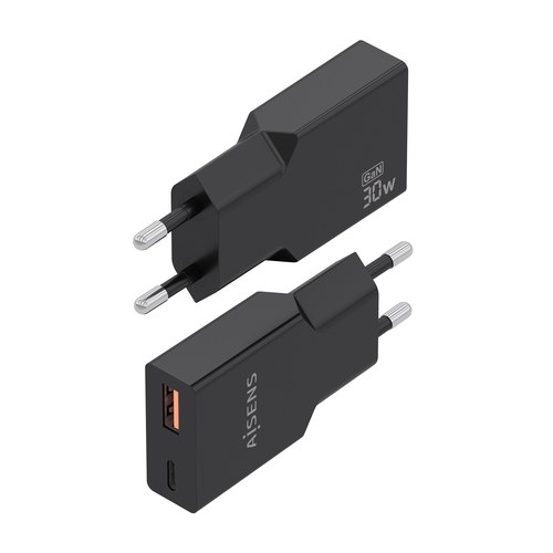 Cargador Ultra Delgado GaN 30W, 1xUSB-C PD3.0 QC4.0, 1xUSB-A QC3.0, Negro