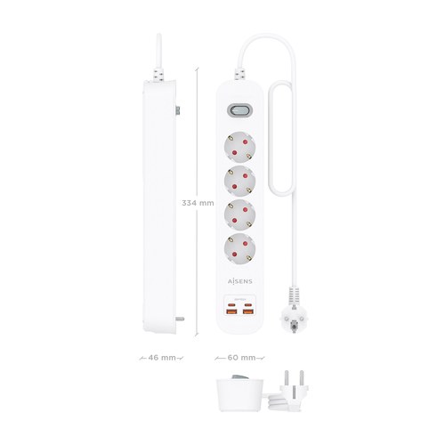 Regleta de enchufes con interruptor, 4 tomas Schuko, 2 puertos USB-C y 2 puertos USB-A. Incorpora un cable de alimentación de 1.4 metros con sección de 3x1.5mm².