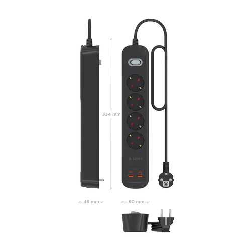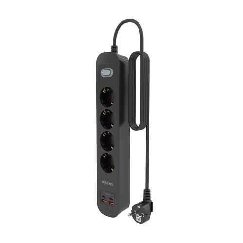 Regleta de enchufes con interruptor, 4 tomas Schuko, 2 puertos USB-C y 2 puertos USB-A. Incorpora un cable de alimentación de 1.4 metros con sección de 3x1.5mm².
