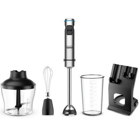 Batidora de mano de GRUNKEL BM-1500SET, 1500W, cuchillas inox x4, TURBO, LED, brazo XL 26 cm, set con vaso, picadora, varilla y soporte.