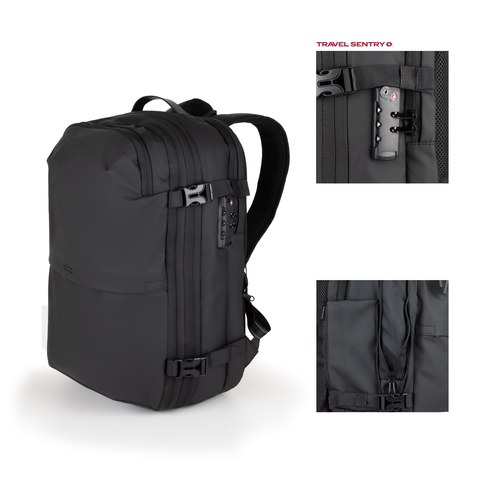Esta mochila de nylon negro revoluciona el viaje con su exclusivo sistema de compresión al vacío (bomba eléctrica incluida), que expande su capacidad de 30 a 55 L para maximizar el almacenamiento sin perder compactación. Su diseño prioriza la seguridad y organización con un compartimento acolchado para portátiles de hasta 17″ con candado de combinación, bolsillos estratégicos para documentos y accesorios, y un tejido resistente al agua. Finalmente, garantiza el máximo confort y ergonomía gracias a sus asas y espalda acolchadas, detalles reflectantes y cinta de acople para maleta, siendo la solución integral para el viajero moderno.