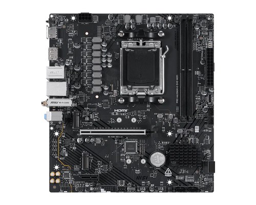 MSI Pro A620AM-G EVO WIFI. Fabricante de procesador: AMD, Socket de procesador: Zócalo AM5, Procesador compatible: AMD Ryzen 7000 Series, AMD Ryzen 8000 Series, AMD Ryzen 9000 Series. tipos de memoria compatibles: DDR5-SDRAM, Memoria interna máxima: 128