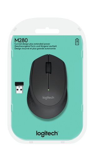 Logitech M280. Factor de forma: mano derecha. Tecnología de detección de movimientos: Óptico, Interfaz del dispositivo: RF inalámbrico, Resolución de movimiento: 1000 DPI, Tipo de botones: Botones presionados, Cantidad de botones: 3, Tipo de desplazamient