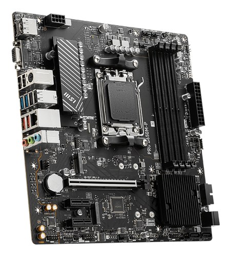 MSI PRO B650M-P. Fabricante de procesador: AMD, Socket de procesador: Zócalo AM5, Procesador compatible: AMD Ryzen 7000 Series. tipos de memoria compatibles: DDR5-SDRAM, Memoria interna máxima: 192 GB, Compatibilidad de ECC: No-ECC. Interfaces de disco de